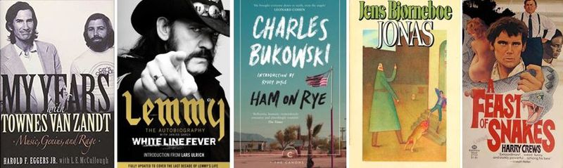 "Ham on Rye" av Charles Bukowski samt "Jonas" av Bjørnebo og absolutt alt av Harry Crews